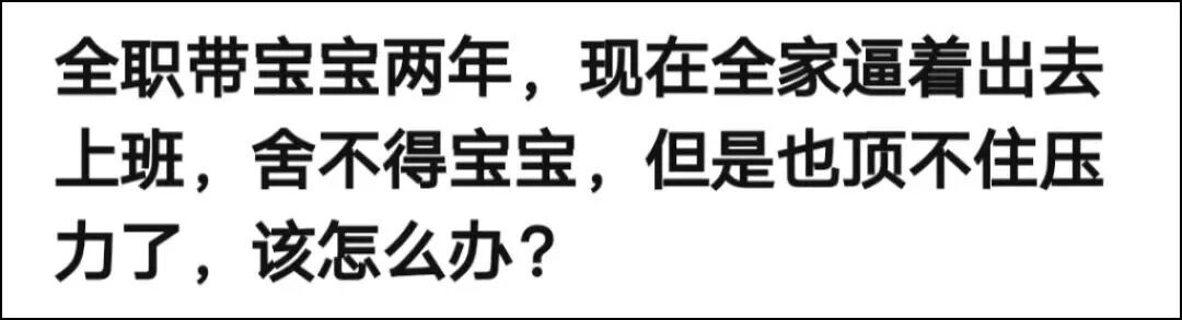 有一位全职姆妈在网上发问:“全职带宝宝两年,当前全家逼着出去上班,舍不得宝宝,但是也顶不住压力了,该怎么办?”
